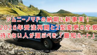 ジムニーノマド ジムニーノマドの納期が絶望的すぎる?2026年再開の真実と2型の変更点を徹底解説 絶望的なジムニーノマドの納期遅延の理由と、2026年1月の受注再開や2型への変更点など最新情報を徹底解説します。さらに、ジムニーノマドの納期を短縮するための具体的な裏技や、あえてシエラを選ぶ選択肢まで、賢く購入するための戦略を網羅しました。 ジムニーノマド